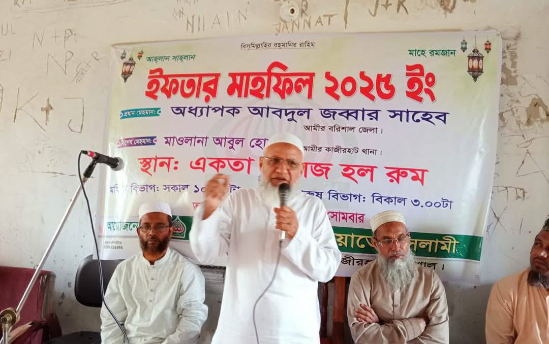নিজস্ব প্রতিবেদক: বাংলাদেশ জামায়াতে ইসলামী মেহেন্দীগঞ্জের কাজীরহাট থানার লতা ইউনিয়ন শাখার উদ্যোগে ইউনিয়ন আমীর মোঃ অহিদুল ইসলাম এর সভাপতিত্বে একতা কলেজ মিলনায়তনে ইফতার মাহফিল ১০ মার্চ সোমবার বিকাল ৩ টায় অনুষ্ঠিত হয়। মাহফিলে প্রধান অতিথি ছিলেন বাংলাদেশ জামায়াতে ইসলামী কেন্দ্রীয় মজলিশে শুরা সদস্য ও বরিশাল জেলা আমীর এবং বরিশাল-৪ (হিজলা-মেহেন্দীগঞ্জ-কাজীরহাট) আসনে জামায়াত মনোনীত জাতীয় সংসদ সদস্য পদপ্রার্থী অধ্যাপক মাওলানা মোহাম্মদ আবদুল জব্বার। বিশেষ অতিথি ছিলেন জেলা জামায়াতের মজলিশে শুরা সদস্য ও কাজীরহাট থানা আমীর মাওলানা আবুল হোসেন।