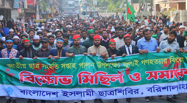 জাতীয় ছাত্র সংহতি সপ্তাহে পালন উপলক্ষে ও জুলাই গণহত্যার বিচারের দাবিতে বিক্ষোভ মিছিল ও সমাবেশ করেছে বাংলাদেশ ইসলামি ছাত্রশিবির বরিশাল মহানগর শাখা। বিক্ষোভ মিছিলটি বরিশাল জিলা স্কুল হয়ে নগরীর সদর রোড থেকে টাউন হলে শেষ হয়।