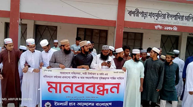 বানারীপাড়ায় ইসলামী ছাত্র আন্দোলনের মানববন্ধন
