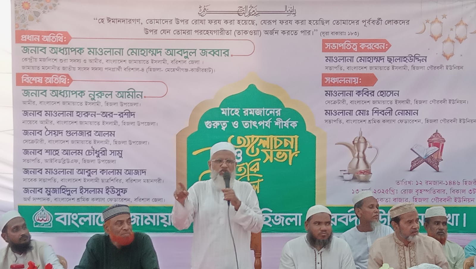 এতে প্রধান অতিথি ছিলেন বাংলাদেশ জামায়াতে ইসলামী কেন্দ্রীয় মজলিশে শুরা সদস্য ও বরিশাল জেলা আমীর এবং বরিশাল-৪ (হিজলা-মেহেন্দীগঞ্জ-কাজীরহাট) আসনে জামায়াত মনোনীত সম্ভাব্য সংসদ সদস্য প্রার্থী অধ্যাপক মাওলানা মোহাম্মদ আবদুল জব্বার।