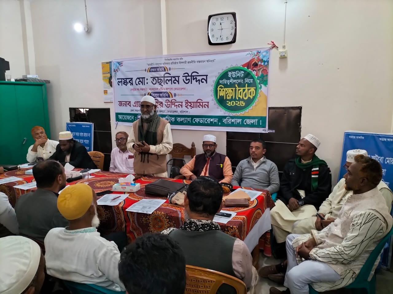 বাংলাদেশ শ্রমিক কল্যাণ ফেডারেশন বরিশাল জেলার হিজলা-মুলাদী উপজেলা ও কাজীর হাট থানার যৌথ উদ্যোগে হিজলা উপজেলা সদরস্থ শহীদ বাকিউল্লাহ স্মৃতি পাঠাগার মিলনায়তনে গত শুক্রবার ইউনিট দায়িত্বশীল শিক্ষা বৈঠক অনুষ্ঠিত হয়। ফেডারেশনের হিজলা উপজেলা সভাপতি মোঃ খলিলুর রহমানের সভাপতিত্বে এবং মুলাদী উপজেলা সভাপতি মোঃ আলাউদ্দিন প্যাদা ও কাজীর থানা সভাপতি মোঃ রুহুল আমিনের যৌথ পরিচালনায় অনুষ্ঠিত শিক্ষা বৈঠকে প্রধান অতিথি ছিলেন বাংলাদেশ শ্রমিক কল্যাণ ফেডারেশনের কেন্দ্রীয় সহ সভাপতি জাতীয় শ্রমিক নেতা লস্কর মোঃ তছলিম উদ্দিন, বিশেষ অতিথি ছিলেন বরিশাল জেলা সভাপতি এ্যাডভোকেট জহির উদ্দিন ইয়ামিন, জেলা সেক্রেটারী অধ্যাপক সাইফুল ইসলাম, হিজলা উপজেলা প্রধান উপদেষ্টা অধ্যাপক নুরুল আমিন। উপস্থিত ছিলেন মুলাদী উপজেলা সেক্রেটারী মোঃ জামাল হোসেন, হিজলা উপজেলা সেক্রেটারী মোঃ জাহাঙ্গীর হোসেন, কাজীর হাট থানা সেক্রেটারী মাওলানা রেজাউল করিমসহ হিজলা-মুলাদী উপজেলা ও কাজীর হাট থানার অন্যান্য নেতৃবৃন্দ ও ইউনিট দায়িত্বশীলবৃন্দ।