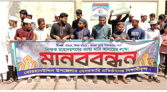 এমপিওভুক্ত শিক্ষকদের ন্যায্য দাবি মেনে নেওয়ার দাবিতে ভোলার বোরহানউদ্দিনে বিভিন্ন শিক্ষা প্রতিষ্ঠানের কয়েক শত শিক্ষার্থী মানববন্ধনসহ বিক্ষোভ সমাবেশ করেছে। মঙ্গলবার সকালে বোরহানউদ্দিন পৌর শহরে থানার সামনে বোরহানউদ্দিন উপজেলার বেসরকারি শিক্ষা প্রতিষ্ঠানের শিক্ষার্থীদের ব্যানারে ওই কর্মসূচি পালিত হয়।