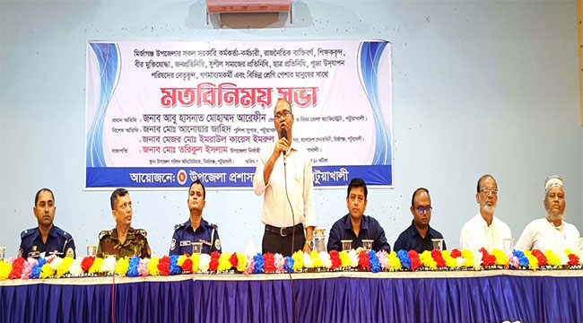 উত্তম গোলদার, মির্জাগঞ্জ, পটুয়াখালী মির্জাগঞ্জ উপজেলার সরকারি কর্মকর্তা-কর্মচারী, শিক্ষকবৃন্দ, বীর মুক্তিযোদ্ধা, জনপ্রতিনিধি, রাজনৈতিক ব্যক্তিবর্গ, সুশীল সমাজের প্রতিনিধি, ছাত্র প্রতিনিধি, পূজা উদযাপন পরিষদের নেতৃবৃন্দ, গণমাধ্যমকর্মী এবং বিভিন্ন শ্রেণী পেশার মানুষের সাথে মতবিনিময় করেছেন পটুয়াখালী জেলার নবাগত জেলা প্রশাসক ও জেলা ম্যাজিস্ট্রেট আবু হাসনাত মোহাম্মদ আরেফীন। সোমবার(৭ সেপ্টেম্বর) সকাল ১১টায় উপজেলা পরিষদ মিলনায়তনে এই মতবিনিময় সভা অনুষ্ঠিত